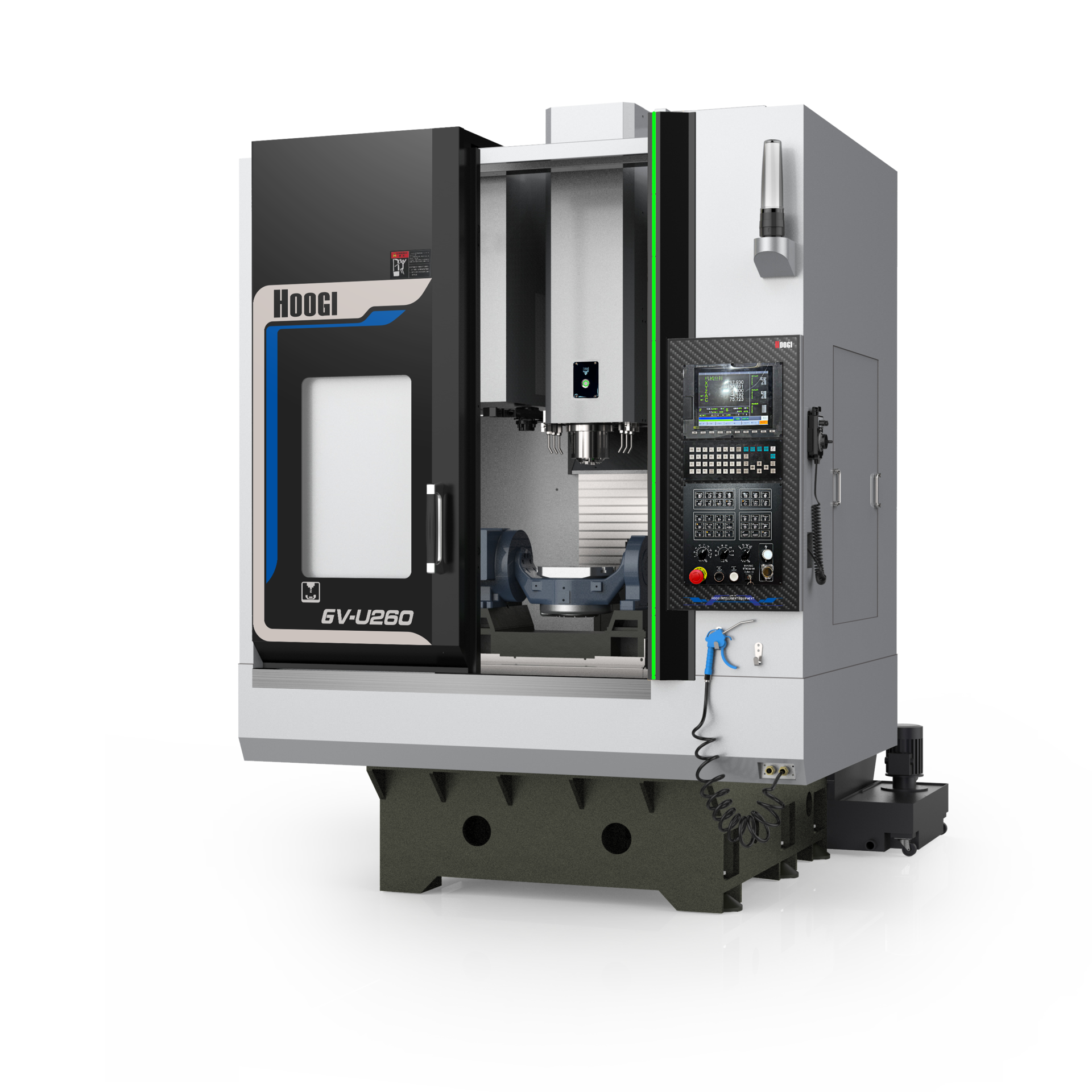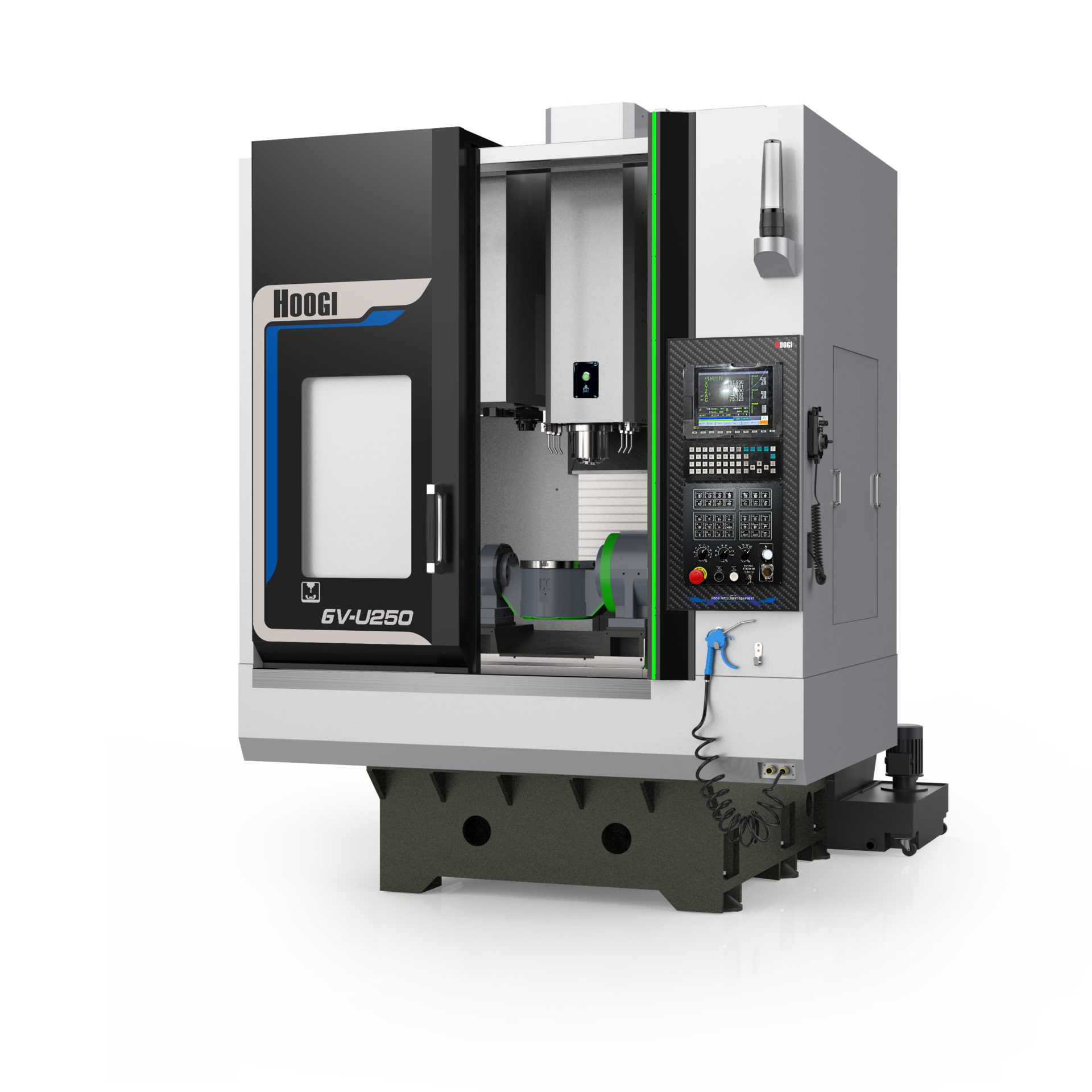 2.五轴转台支架和X向滑板设计成一个整体,机床刚性更强,精度更高。